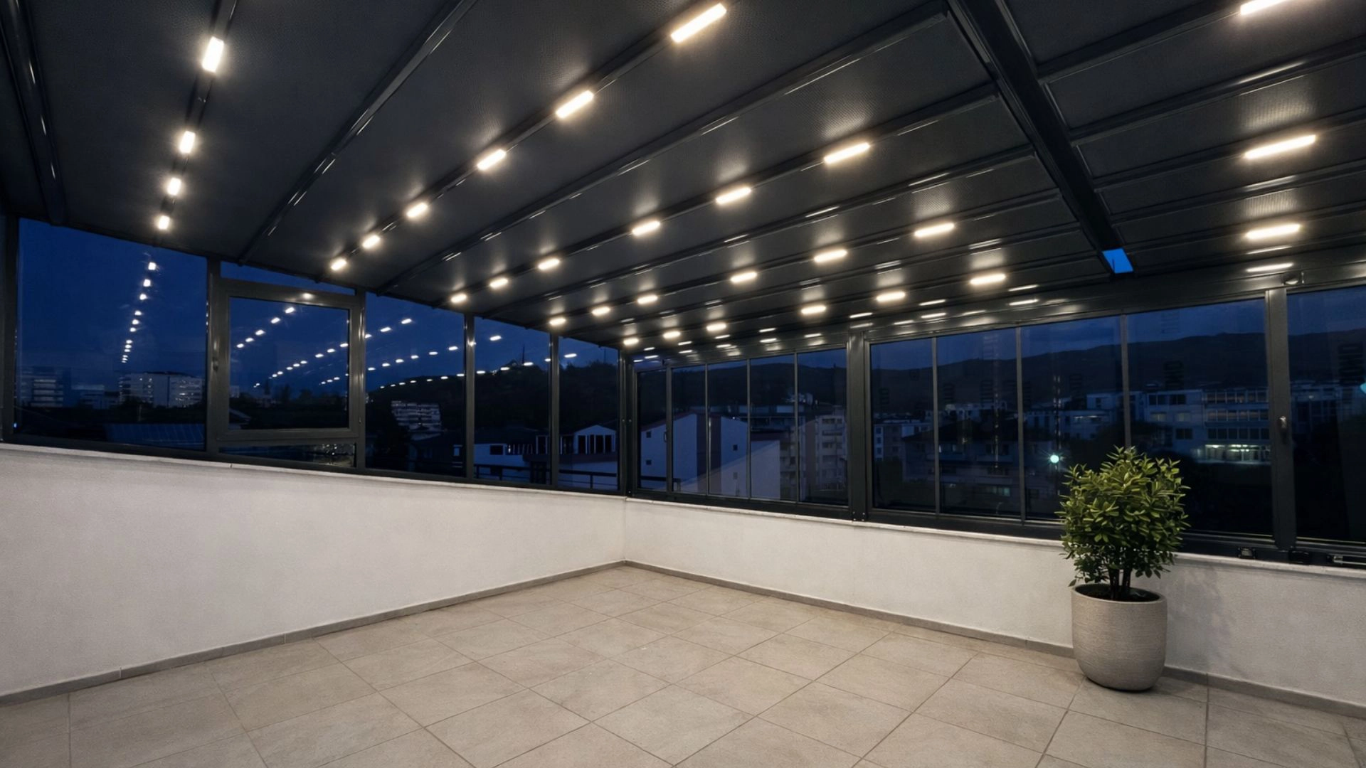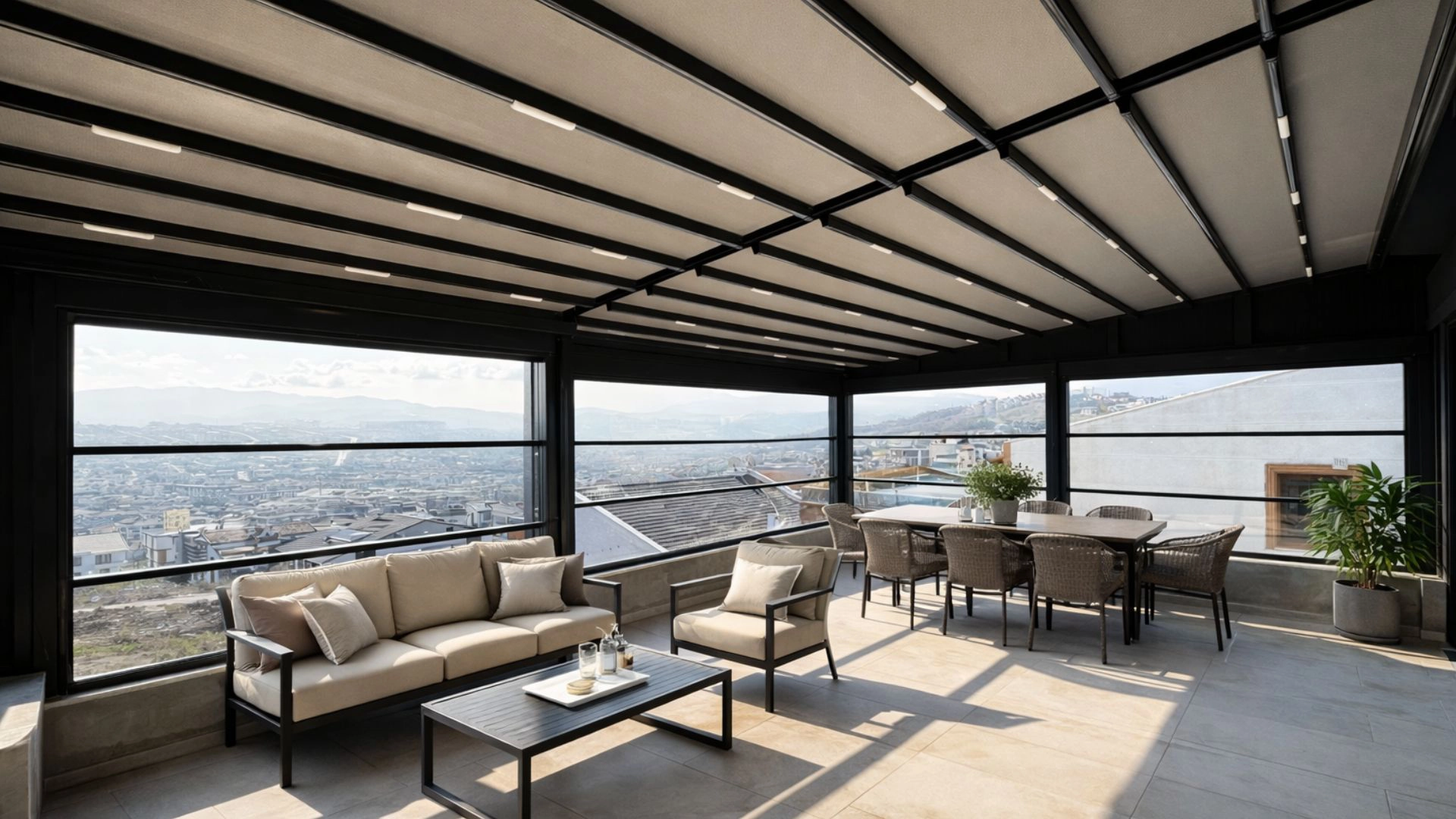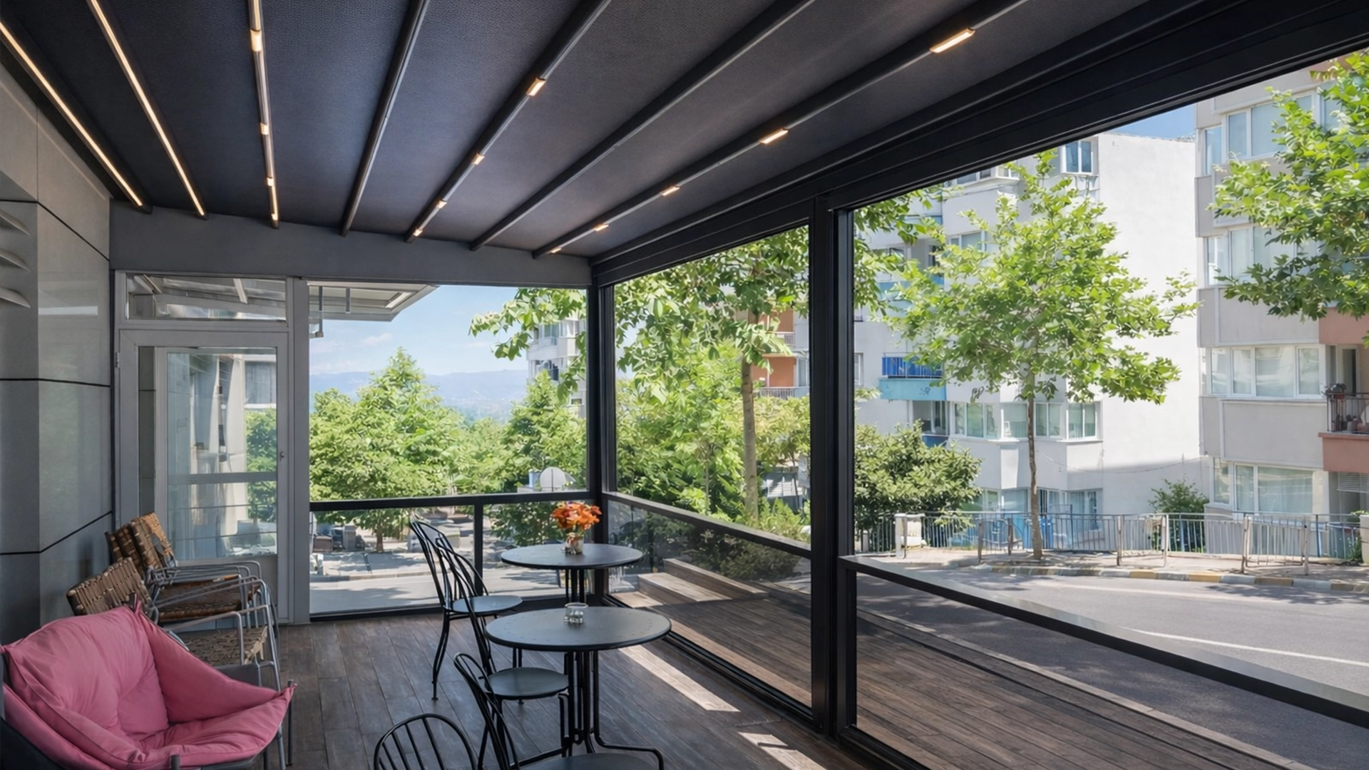 Awning; Thanks to the engine located at the top of the system, it moves with the wheels on the rail profile. The engine transfers the movement with a steel belt. Thus, the rotating engine allows the awning to move up and down.